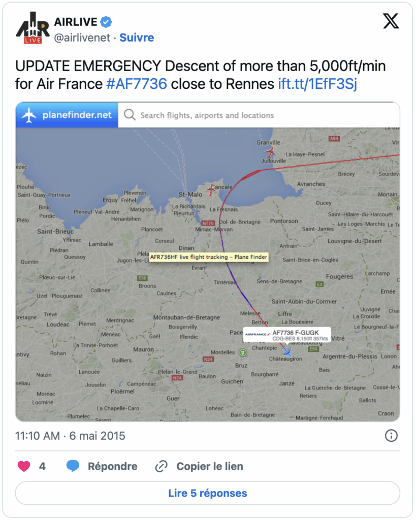 Le 6 mai 2015, j’étais copilote d’un Airbus A318 reliant Paris CDG à Brest. Vers le milieu du vol, l’équipage commercial nous a informé de la présence de fumée en cabine. Immédiatement, le commandant de bord et moi-même nous sommes équipés de notre masque à oxygène, et nous avons annoncé une descente d’urgence au contrôle aérien. Nous leur avons rapidement fait part de notre intention de nous poser à Rennes dont nous étions proches.